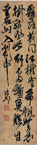 傅山,1607年生,1684年逝世,山西阳曲人。明末清初思想家、书画家。字青主,青竹、别号公它、又字乔山、亦曰石道人。入清后又名真山(法名),号朱衣道人,晚称老蘖禅。一作太原人。傅氏通经史、诸子、佛道之学,精医学。兼善诗书画。其书篆、隶、正、草无不精。尤以行书更具特色。马宗霍《霎岳楼笔谈》称“青主隶书,论者谓怪过而近于俗;然草书则宕逸浑脱,可与石斋(黄道周)、觉斯(王铎)伯仲。”工画,其画竹亦有气韵。富收藏金石、精鉴别,尤精篆刻。著有《霜江龛集》十二卷,《荀子评注》等。传世书迹较多。《孟浩然诗》,草书孟浩然五律十八首。纸本墨迹。纵28.2厘米,横394.8厘米。系友人张钺持纸索书,以余墨当场挥就。傅山是一位有创造性的书家。他遵循自己的信条,作字先作人,这在他的书法活动中起了很大作用。此帧草书孟浩然诗,充分反映了他的艺术观点和思想追求。此诗卷落笔情深,气势磅礴。其草书笔画上变化幅度较大,而且不甚讲究转折起伏,更加夸张,极得乱头粗服之趣。看似杂乱无章,信笔涂成,仔细读来却觉有条不紊;用墨枯润杂揉,轻重相间,疾涩相生;加之结体以横风斜雨的形态,倾侧欹斜,勾连揖让,构成了沉着痛快、险峻跌宕的格调。此件草书诗卷为其代表风格。